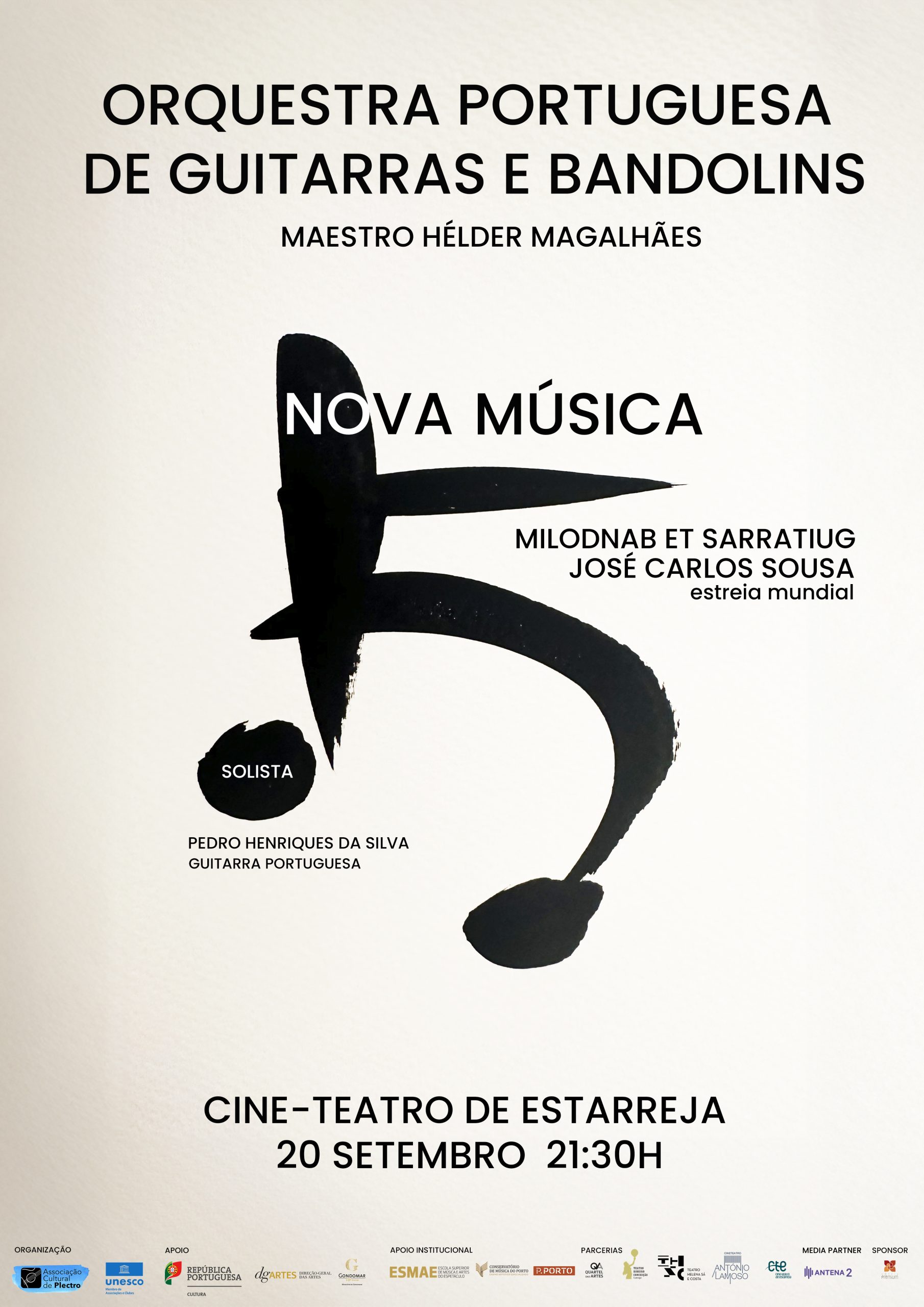 Esta será a última estreia, cuja obra do compositor 𝐉𝐨𝐬é 𝐂𝐚𝐫𝐥𝐨𝐬 𝐒𝐨𝐮𝐬𝐚 se intitula “𝐌𝐢𝐥𝐨𝐝𝐧𝐚𝐛 𝐞𝐭 𝐒𝐚𝐫𝐫𝐚𝐭𝐢𝐮𝐠”. Contaremos com 𝐏𝐞𝐝𝐫𝐨 𝐇𝐞𝐧𝐫𝐢𝐪𝐮𝐞𝐬 𝐝𝐚 𝐒𝐢𝐥𝐯𝐚 como solista na guitarra portuguesa.