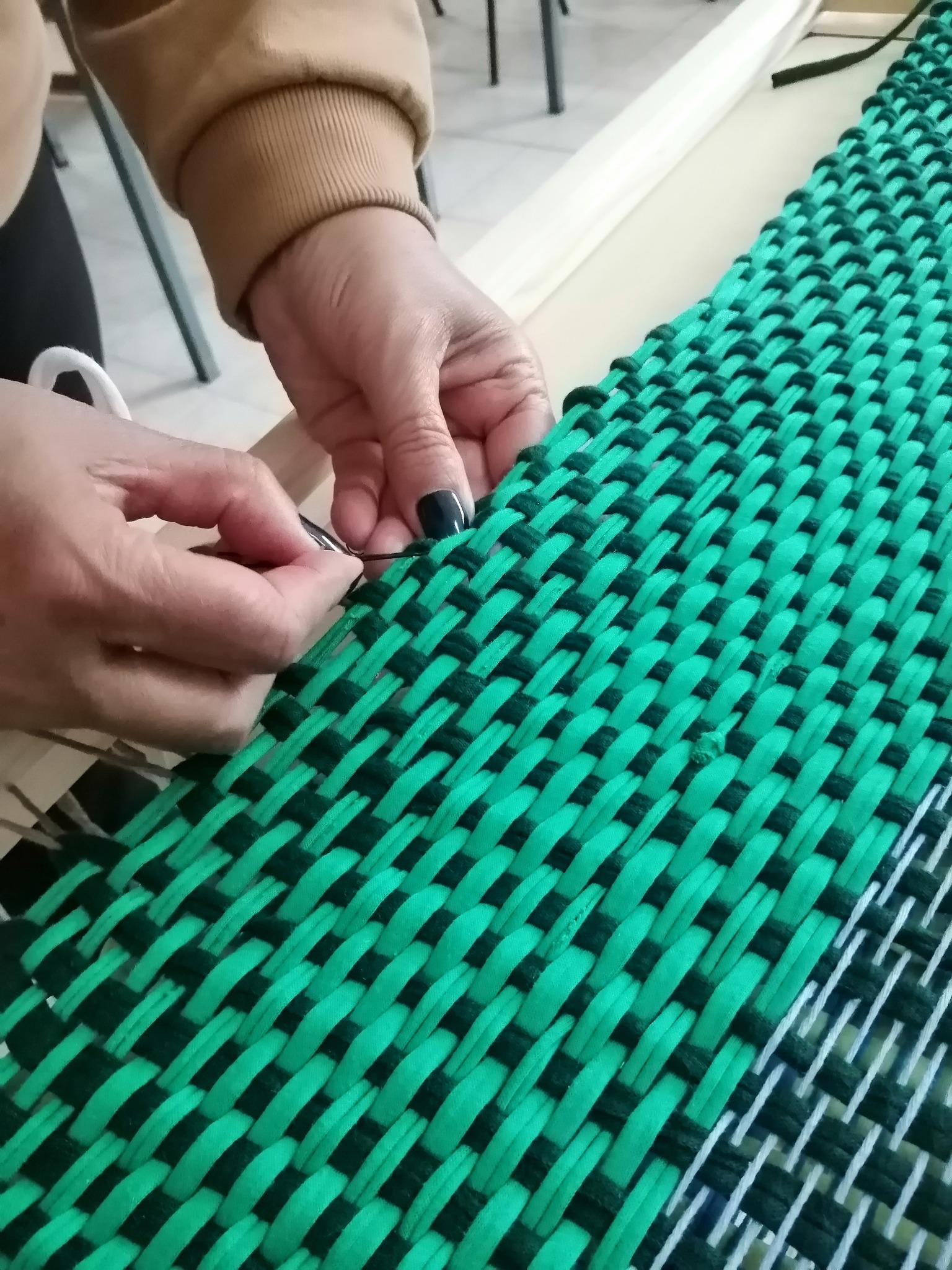 A escolha dos materiais prende-se com a própria história da tecelagem local, caracterizada pelos ourelos. Desta forma e, para valorizar este património, a eleição das fibras que compõem a base da trama (os trapos e o algodão), teria obrigatoriamente de estar interligado com esta tradição. As cores foram cuidadosamente escolhidas para representar cada estação do ano, e na decoração dos painéis foram utilizadas técnicas mistas que combinam a tapeçaria, o macramé entre soluções que se adequassem à representação dos elementos decorativos.
