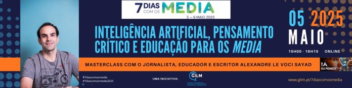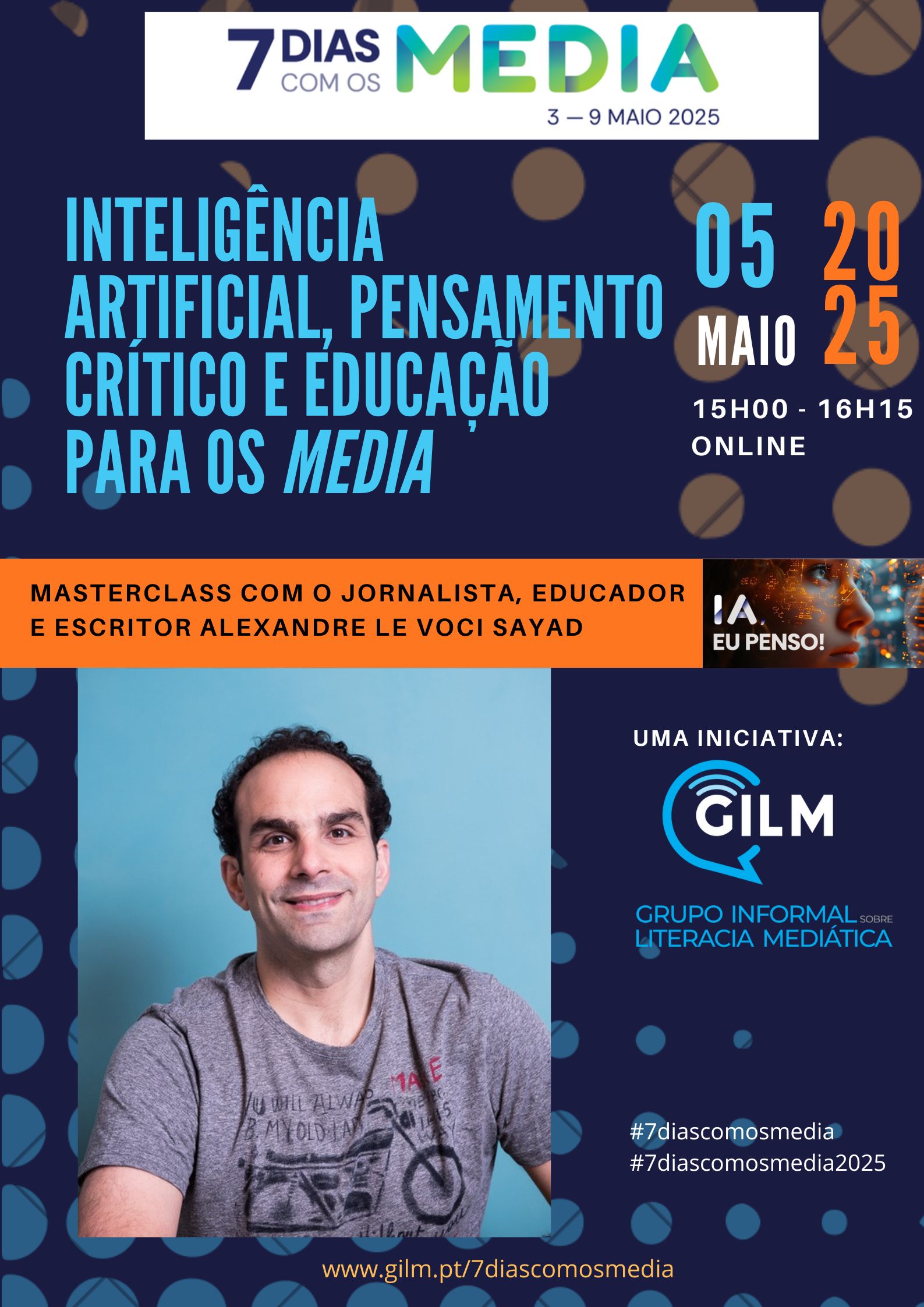 Com o tema “Inteligência Artificial, Pensamento Crítico e Educação para os Media”, esta aula aberta contará com a participação de Alexandre Le Voci Sayad, jornalista, educador, escritor, mestre em Inteligência Artificial e Ética e doutorando em políticas de lifelong learning e IA.