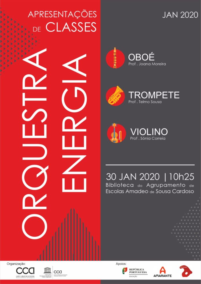 A Orquestra Energia está de regresso e em toda a força. A primeira apresentação de Classe dos alunos da Orquestra Energia do Agrupamento de Escolas Amadeo de Sousa Cardoso será a 30 de janeiro, pelas 10h25. A ideia é simples, quem por esta hora, (alunos, professores e colaboradores,…) passar pela Biblioteca do Agrupamento de Escolas Amadeo de Sousa Cardoso vai ser surpreendido por um agradável momento de Música, protagonizado pela Orquestra Energia.
